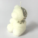 La Bougie Ourson à la Feuille d'Or blanc présente un adorable petit ourson assis blanc ivoire, avec des détails de cristaux de roses finement sculptés.